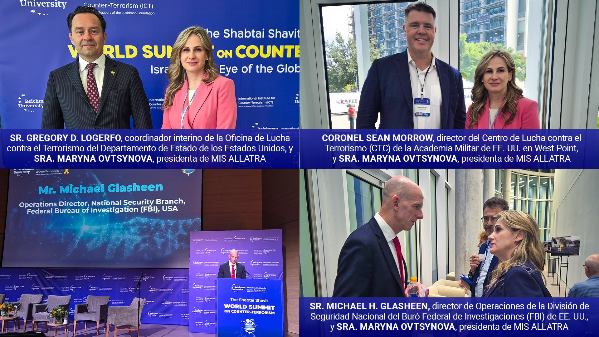 Sr. Michael H. Glasheen, director de Operaciones de la División de Seguridad Nacional del Buró Federal de Investigaciones (FBI) de EE. UU.; Sr. Jonathan Davis, vicepresidente de Relaciones Exteriores y director de la Escuela Internacional Raphael Recanati (RRIS) de la Universidad Reichman; teniente coronel (res.) Dr. Uri Ben Yaakov, director de Operaciones (COO) y principal investigador del Instituto Internacional para la Lucha contra el Terrorismo (ICT) de la Universidad Reichman; Sra. Kamila Marchenko, representante oficial de MIS ALLATRA en Israel; y Sra. Maryna Ovtsynova, presidenta de MIS ALLATRA, en la Cumbre Mundial Shabtai Shavit sobre la Lucha contra el Terrorismo