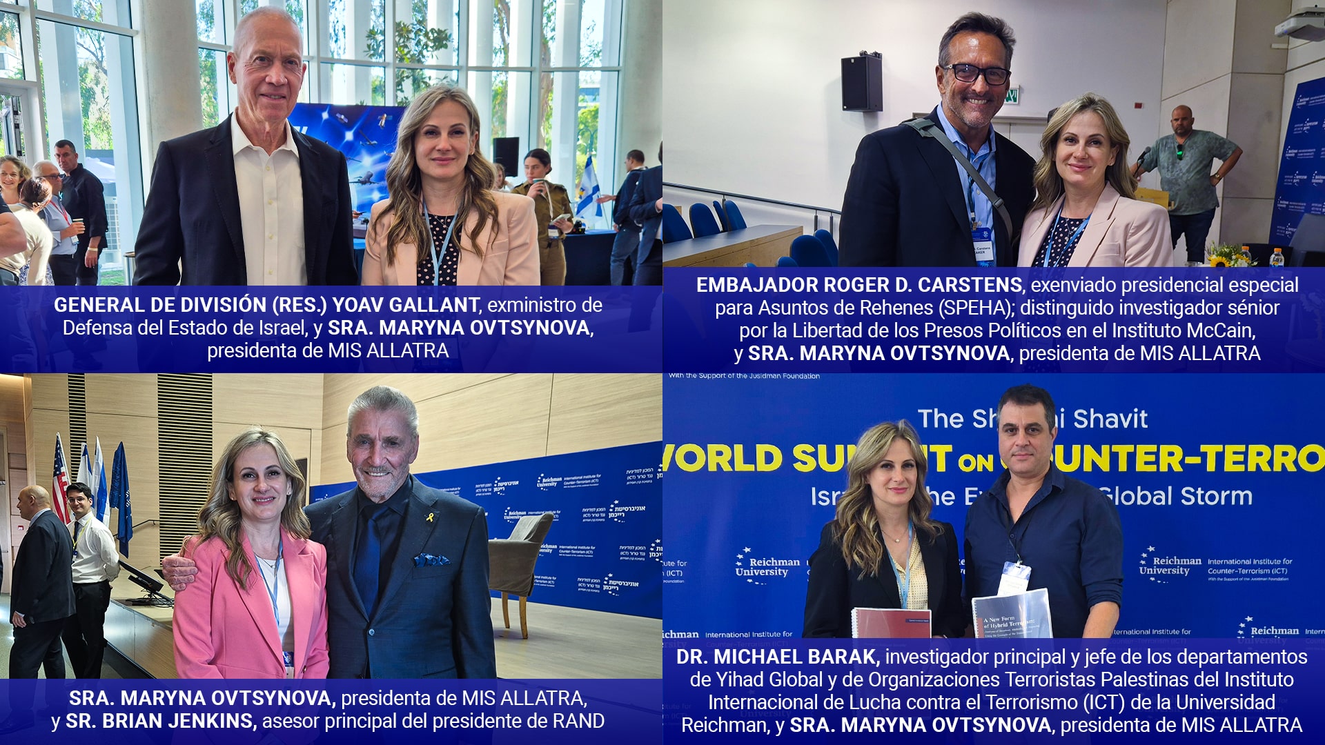 General de división (res.) Yoav Gallant, exministro de Defensa del Estado de Israel; embajador Roger D. Carstens, exenviado presidencial especial para Asuntos de Rehenes (SPEHA) y distinguido investigador sénior de Libertad para los Prisioneros Políticos del Instituto McCain; Sr. Brian Jenkins, asesor principal del presidente de RAND; Dr. Michael Barak, investigador principal y jefe de los Departamentos de Yihad Global y de Organizaciones Terroristas Palestinas del Instituto Internacional para la Lucha contra el Terrorismo (ICT) de la Universidad Reichman; y Sra. Maryna Ovtsynova, presidenta de MIS ALLATRA, en la Cumbre Mundial Shabtai Shavit sobre la Lucha contra el Terrorismo