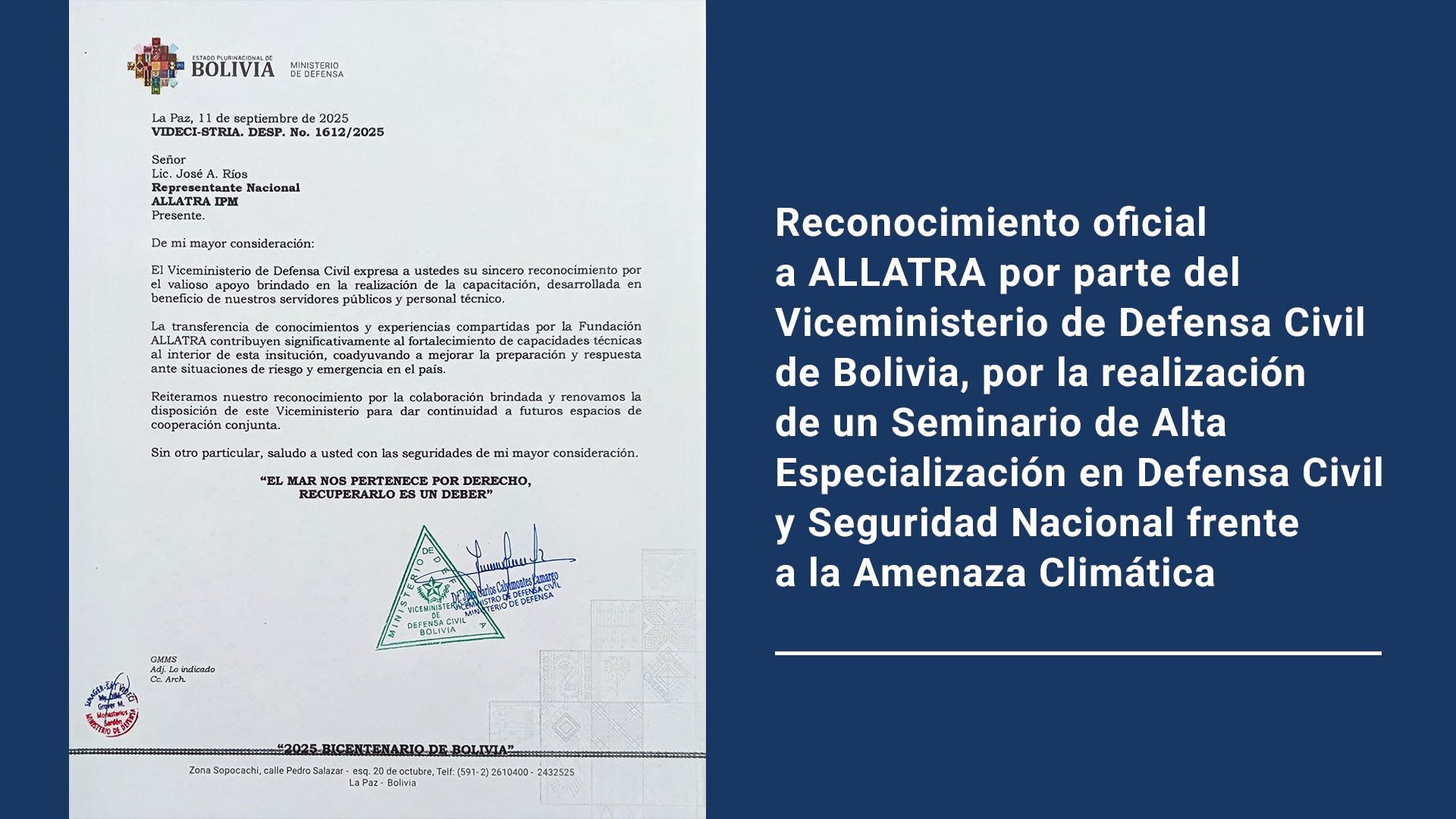 Reconocimiento oficial a ALLATRA por parte del Viceministerio de Defensa Civil de Bolivia, por la realización de un Seminario de Alta Especialización en Defensa Civil y Seguridad Nacional frente a la Amenaza Climática