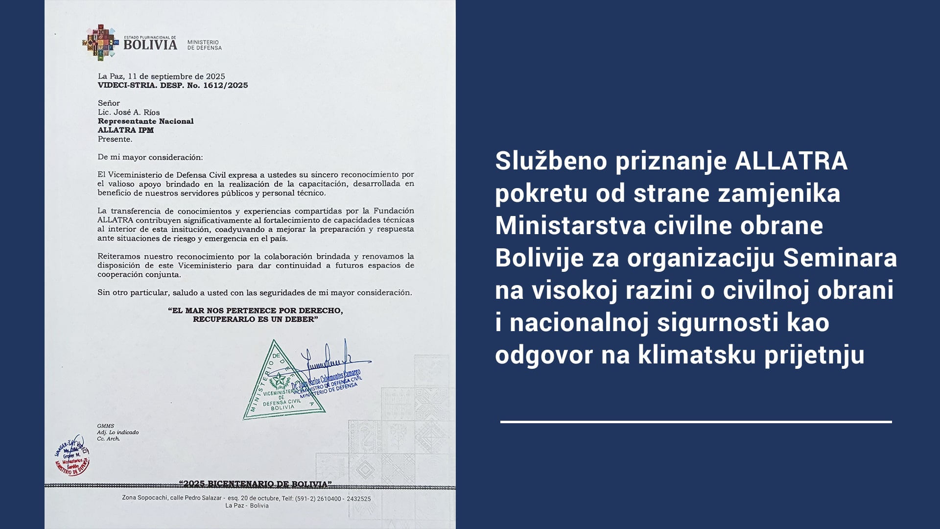 Službeno priznanje ALLATRI od strane Potpredsjedništva civilne obrane Bolivije za organizaciju Seminara visoke razine o civilnoj obrani i nacionalnoj sigurnosti pred klimatskom prijetnjom