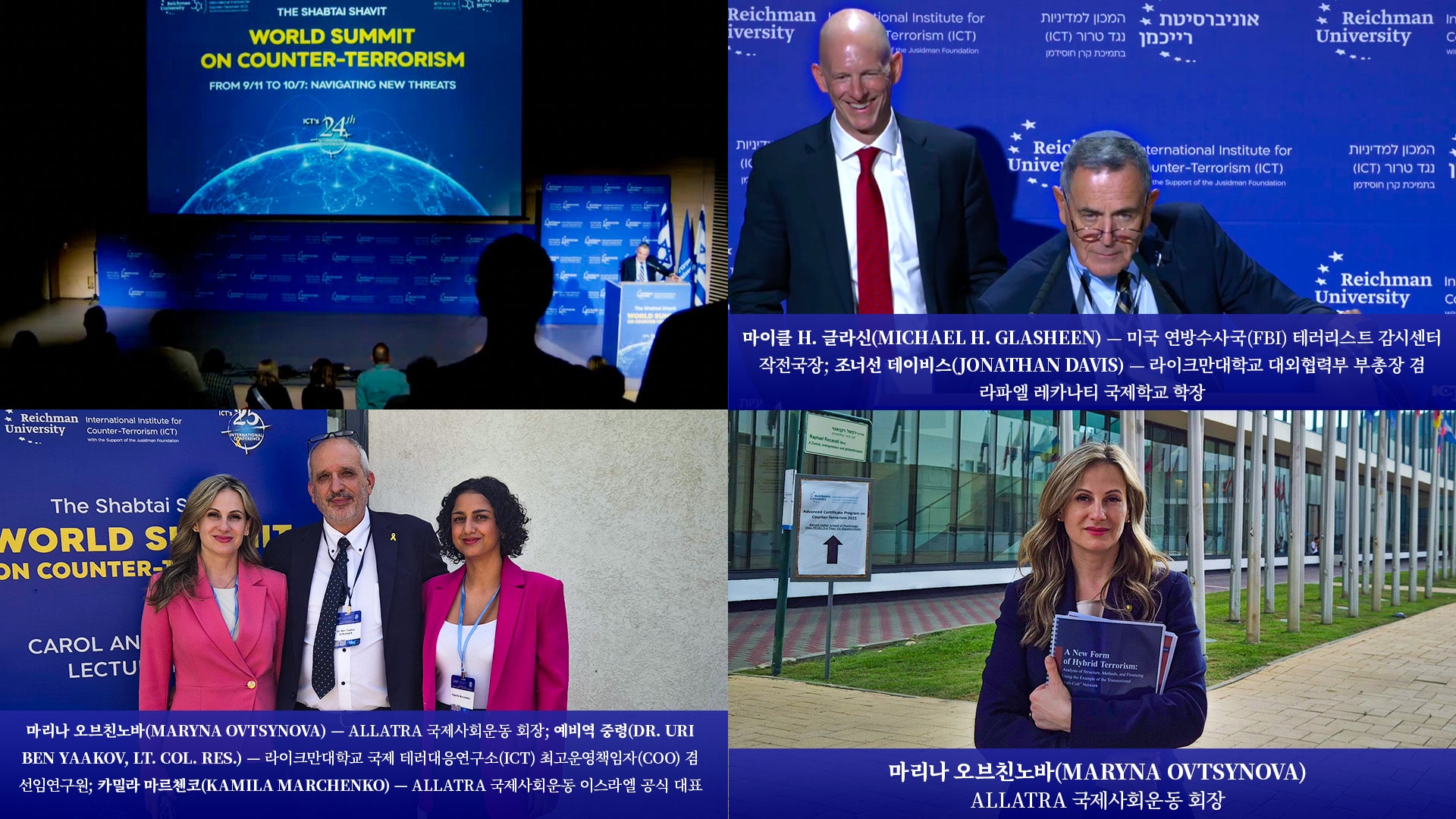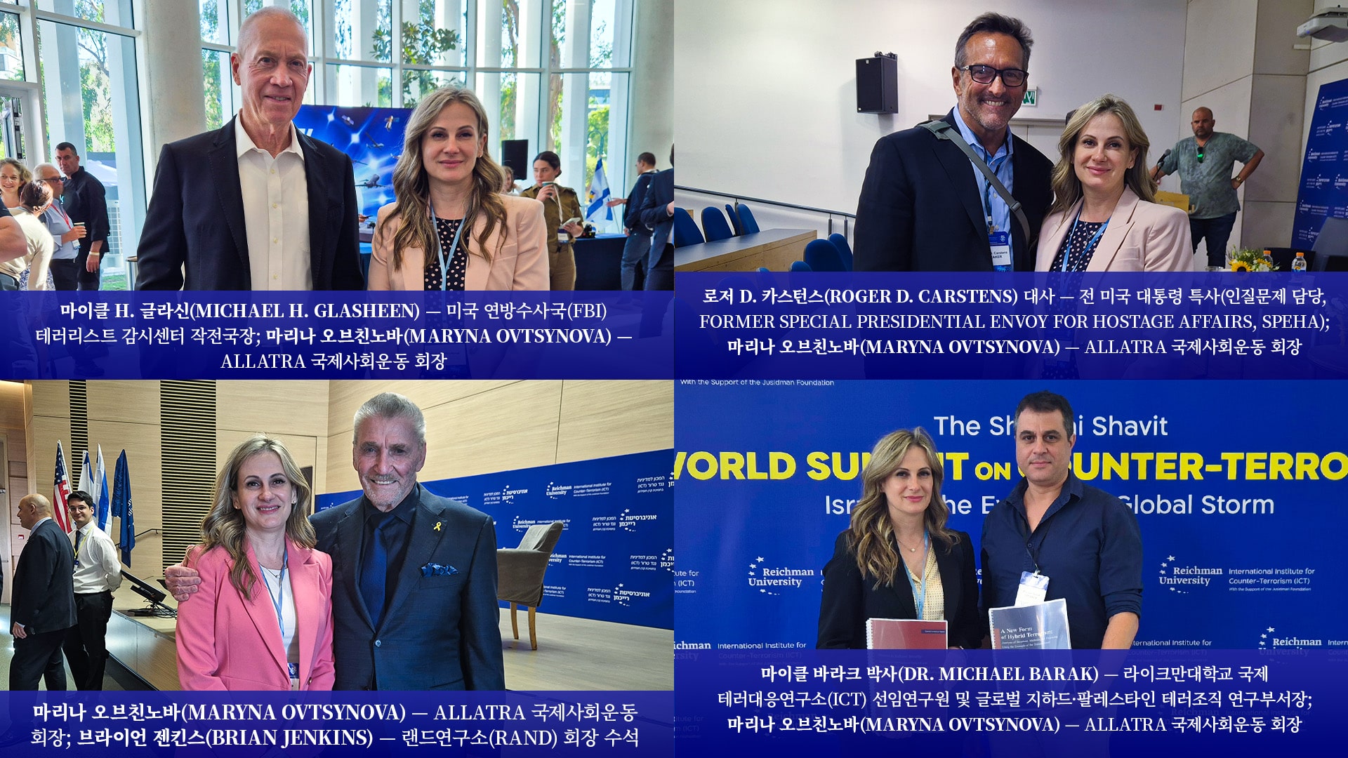 카밀라 마르첸코(Kamila Marchenko) — 이스라엘 내 ALLATRA 국제사회운동 공식 대표; 마리나 오브친노바(Maryna Ovtsynova) — ALLATRA 국제사회운동 회장; 유리엘 라이크만(Uriel Reichman) — 라이크만대학교 설립자 및 이사회 의장; 션 모로우(Col. Sean Morrow) — 미 육군사관학교 웨스트포인트 테러대응센터(CTC) 소장; 그레고리 D. 로저포(Mr. Gregory D. LoGerfo) — 미국 국무부 대테러국(Bureau of Counterterrorism) 대행 조정관, 2025 샤브타이 샤비트 세계 테러대응 정상회의(Shabtai Shavit World Summit on Counter-Terrorism)에서