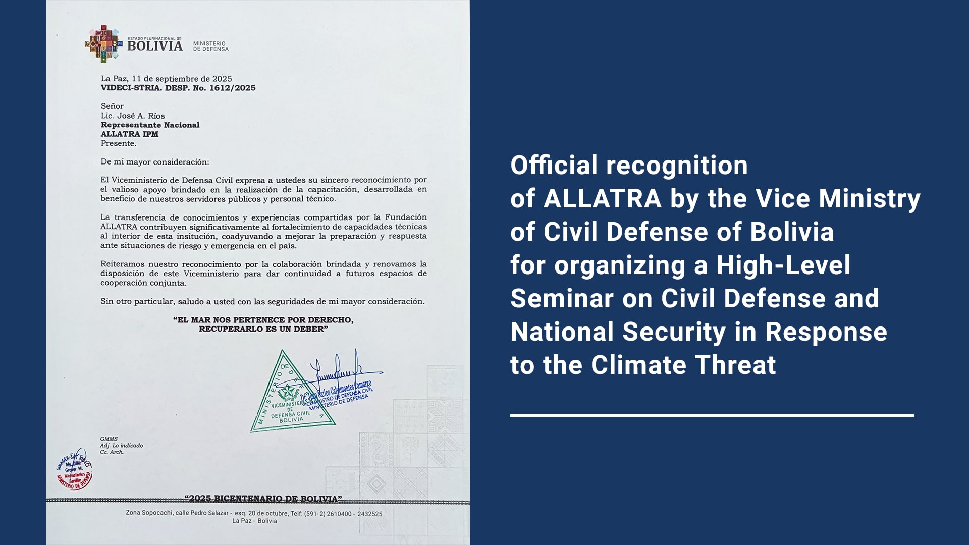 Official recognition of ALLATRA by the Vice Ministry of Civil Defense of Bolivia for organizing a High-Level Seminar on Civil Defense and National Security in Response to the Climate Threat