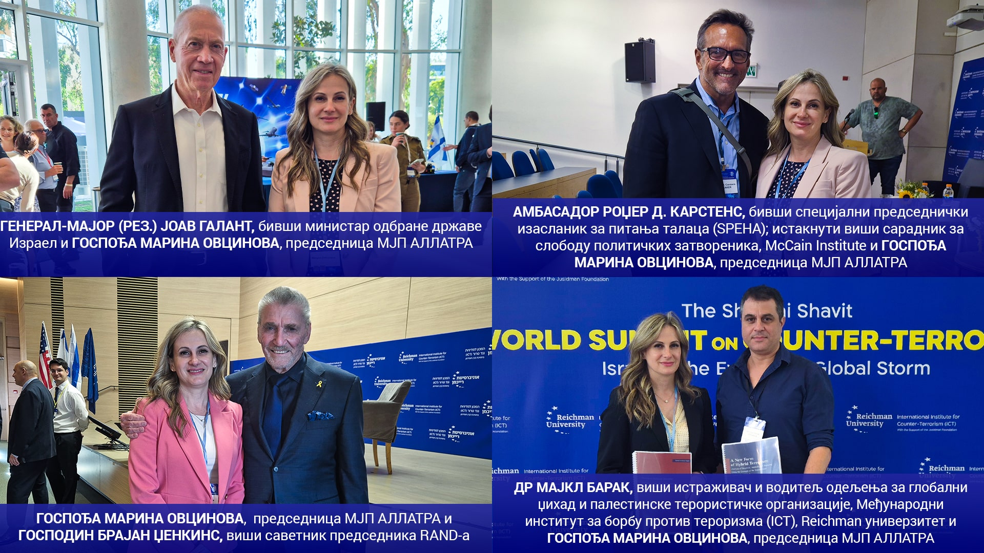 Господин Мајкл Х. Глешин, директор операција, Национални безбедносни одсек, Федерални истражни биро (FBI), САД; господин Џонатан Дејвис, потпредседник за спољне односе и руководилац Међународне школе Raphael Recanati (RRIS), Reichman универзитет; потпуковник (рез.) др Ури Бен Јаков, главни оперативни директор (COO) и виши истраживач, Међународни институт за борбу против тероризма (ICT), Reichman универзитет; госпођа Камила Марченко, званична представница МЈП АЛЛАТРА у Израелу; госпођа Марина Овцинова, председница МЈП АЛЛАТРА на Светском самиту Shabtai Shavit о борби против тероризма
